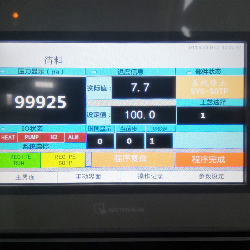 | Opis procesu działania sprzętu | W sprzęcie zastosowano programowanie sterowania przemysłowego PLC. Programowalne sterowanie obejmuje stan uruchomienia/zatrzymania pompy próżniowej, ustawienie poziomu próżni, czas utrzymywania próżni, czas napełniania gazem obojętnym, czas zamknięcia elektrozaworu gazu obojętnego oraz rozpoczęcie/zakończenie cyklu ogrzewania. | ||